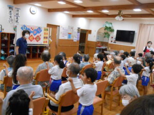 近所の保育園の子供たちを呼んで、お遊戯を披露してもらったり、手作りのプレゼントをもらいました。